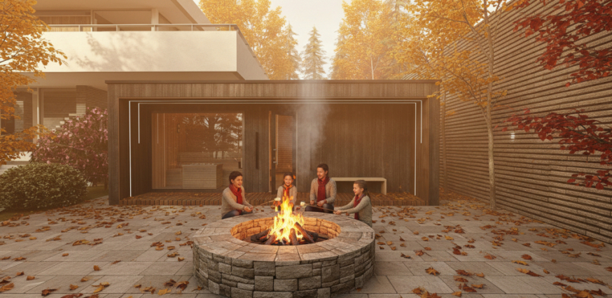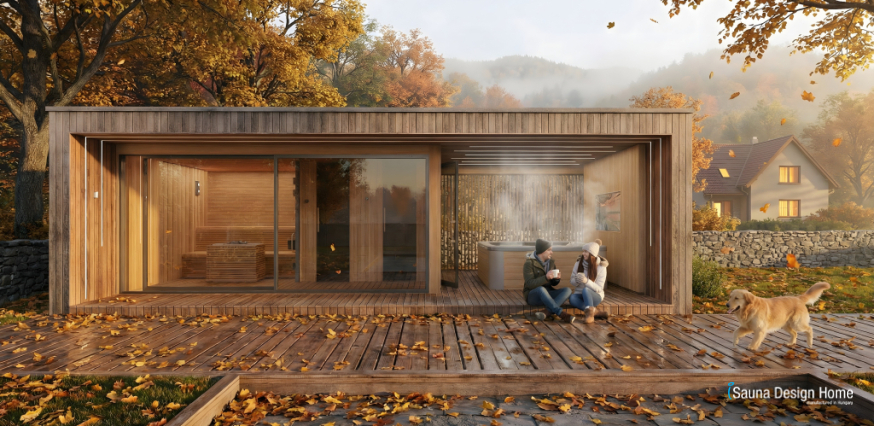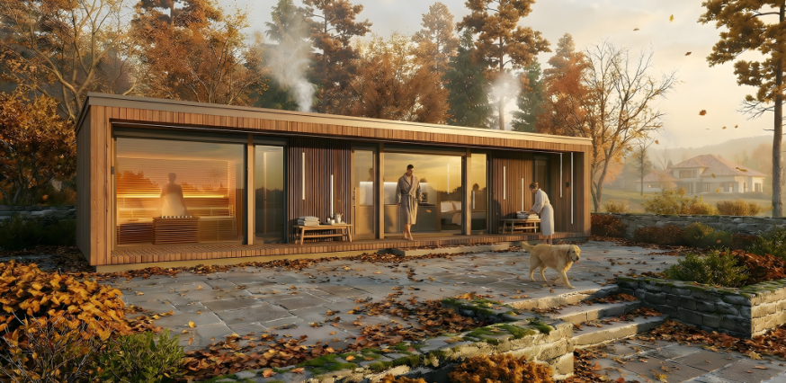 Im Herbst verlangsamen die Farben der Natur und das Abendlicht den Rhythmus die Sauna wird zu einem Übergang zwischen Tag und Abend.